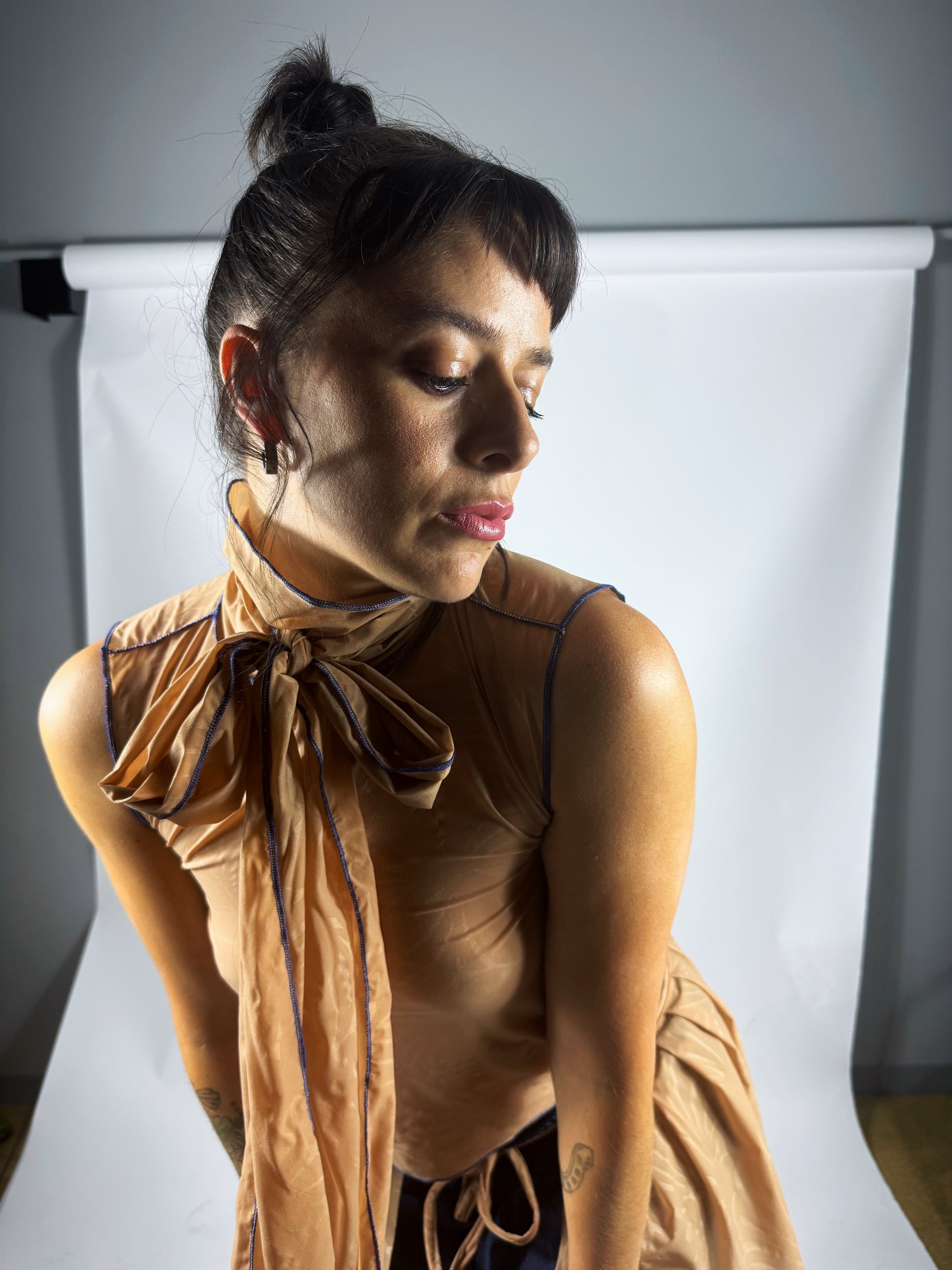Un ensemble nude, légèrement transparent, qui joue avec la suggestion. Col montant à nouer, jupette à superposer.